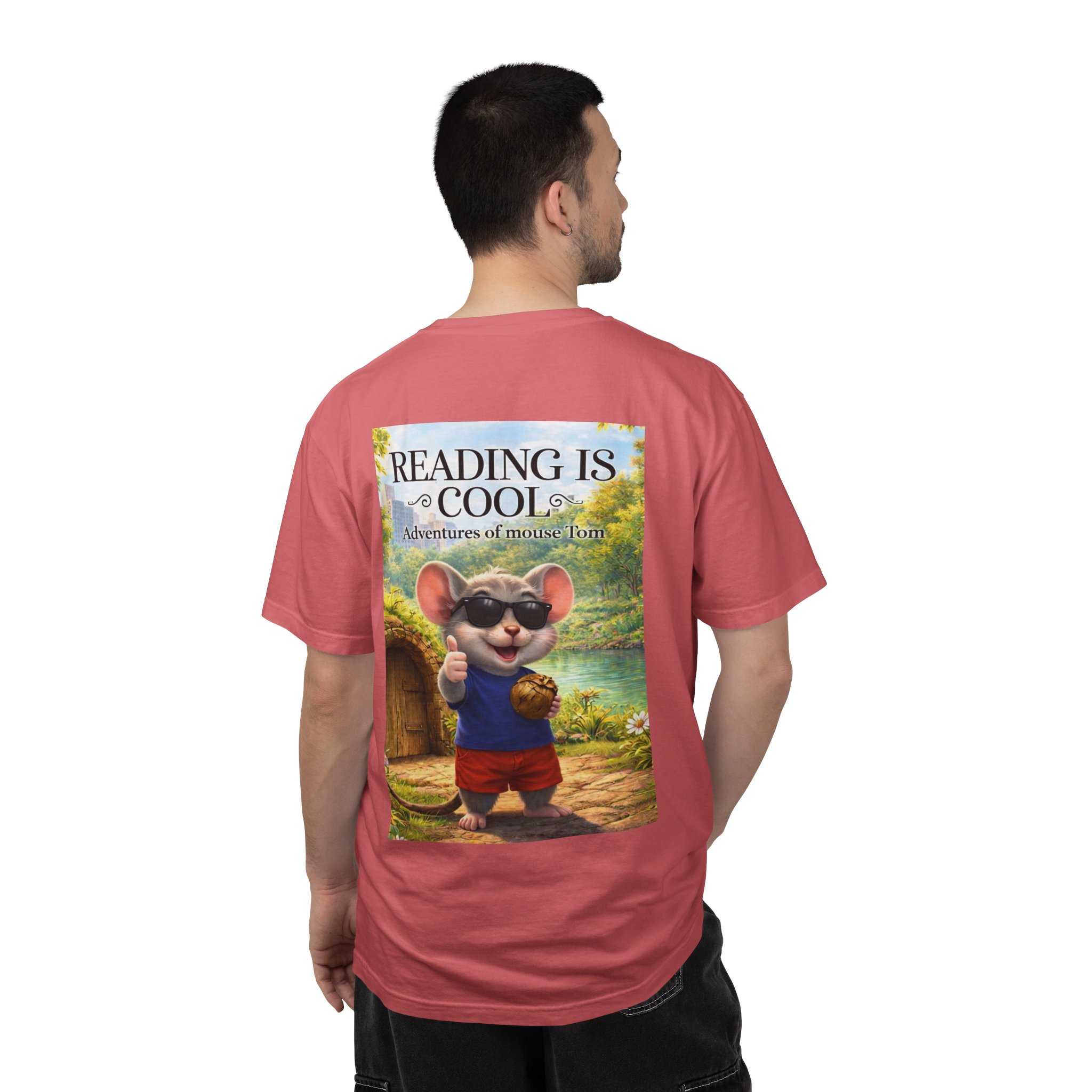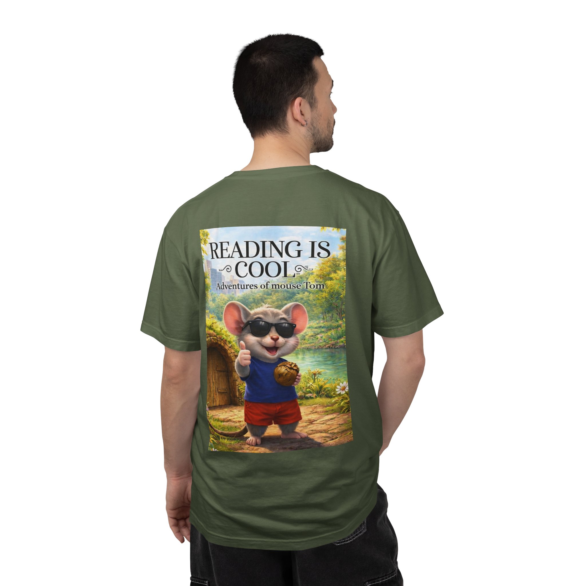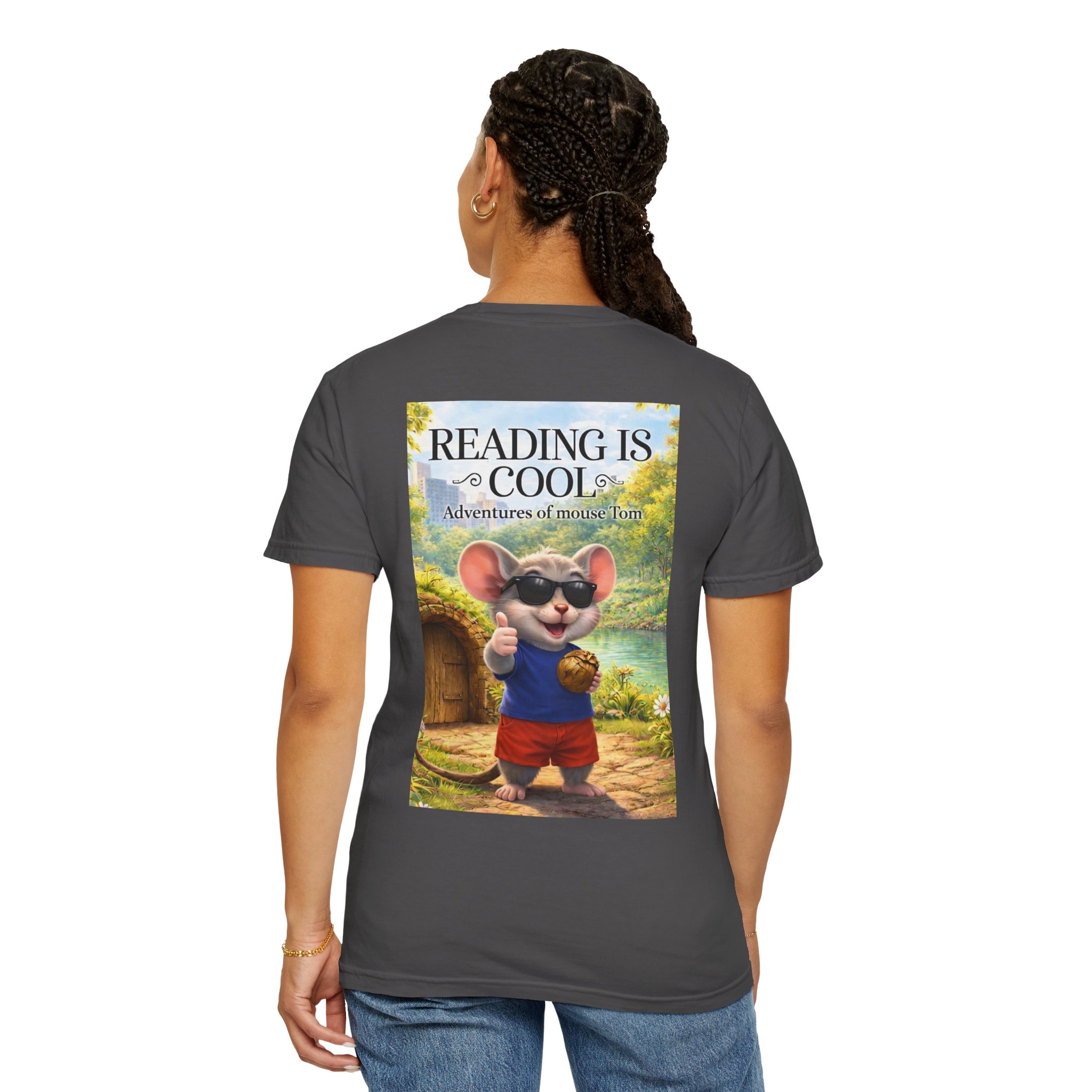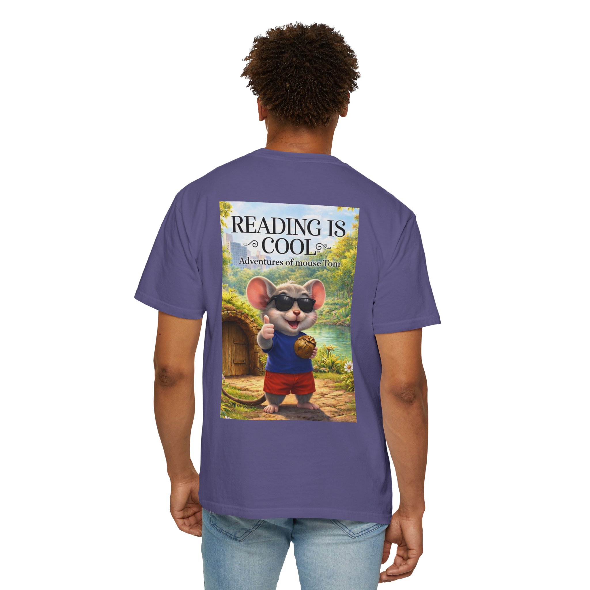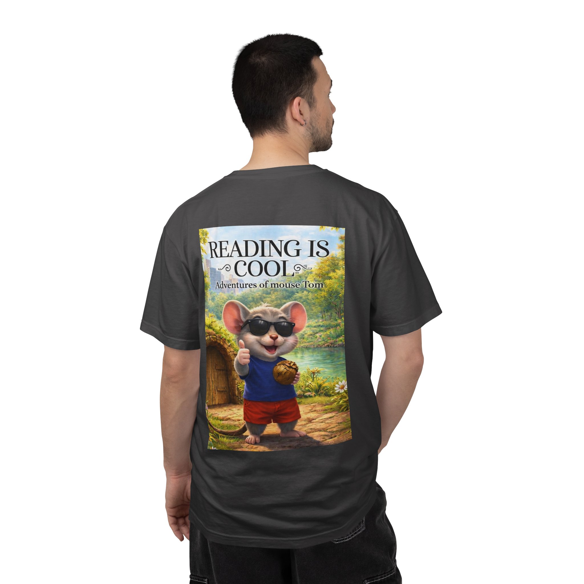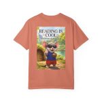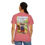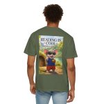 This relaxed-fit tee brings a soft, lived-in feel and a playful story to your everyday wardrobe. Garment-dyed and heavyweight, the shirt wears in beautifully—the color deepens and the fabric softens with every wash. On the front, a small, cheerful mouse in sunglasses adds a wink of personality; the back shows a full, bright illustration with the phrase “READING IS COOL” and a cozy, storybook scene. Wear it while reading in a sunny nook, taking a slow weekend stroll, or sharing a quiet moment with young readers. The roomy cut and sturdy construction let the design take center stage while staying comfortable through regular wear.