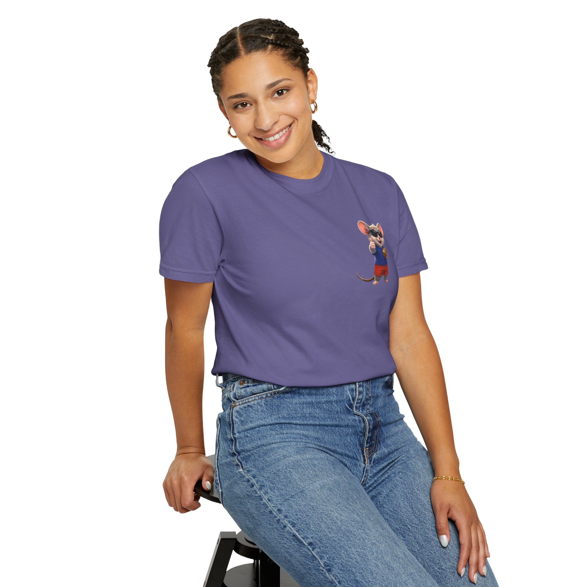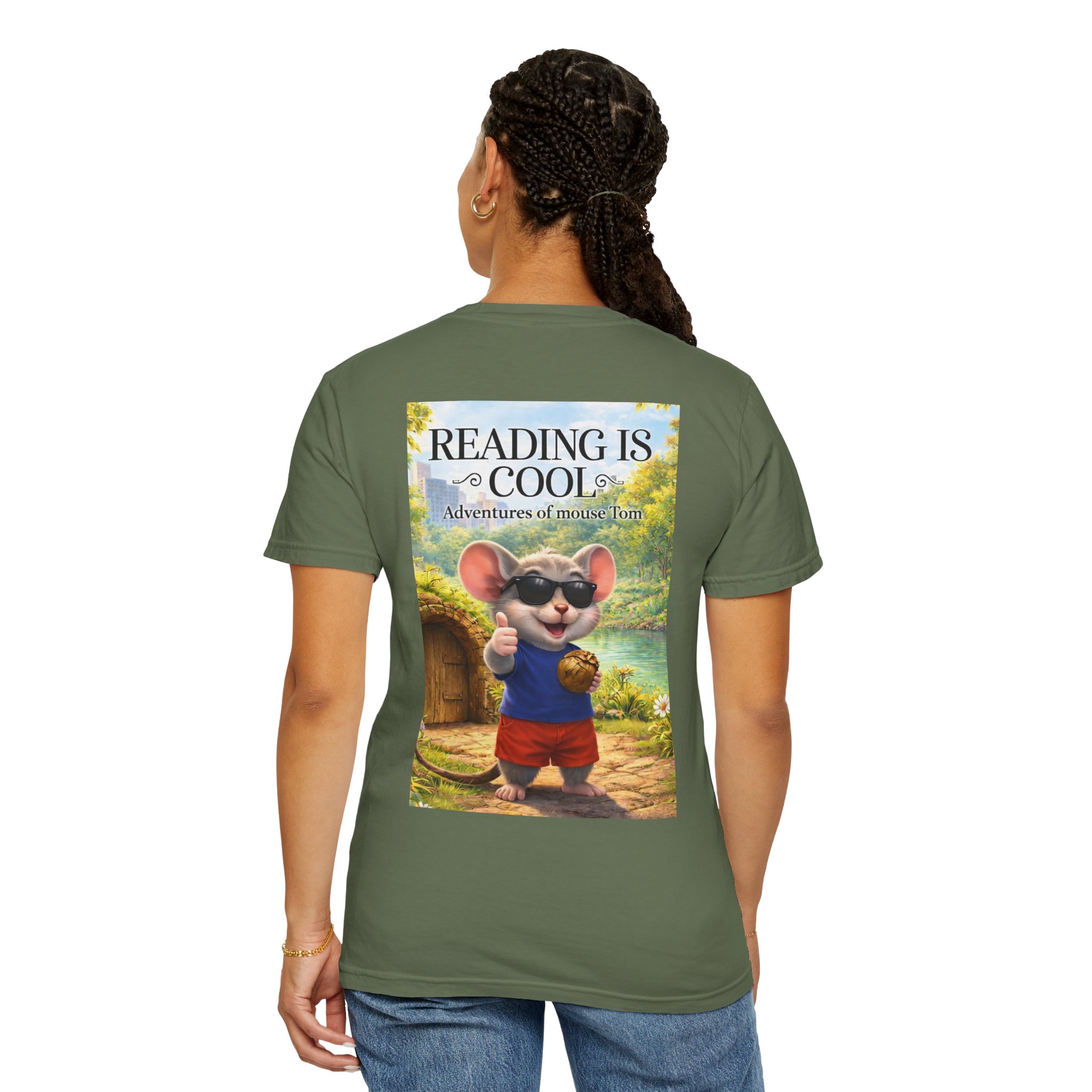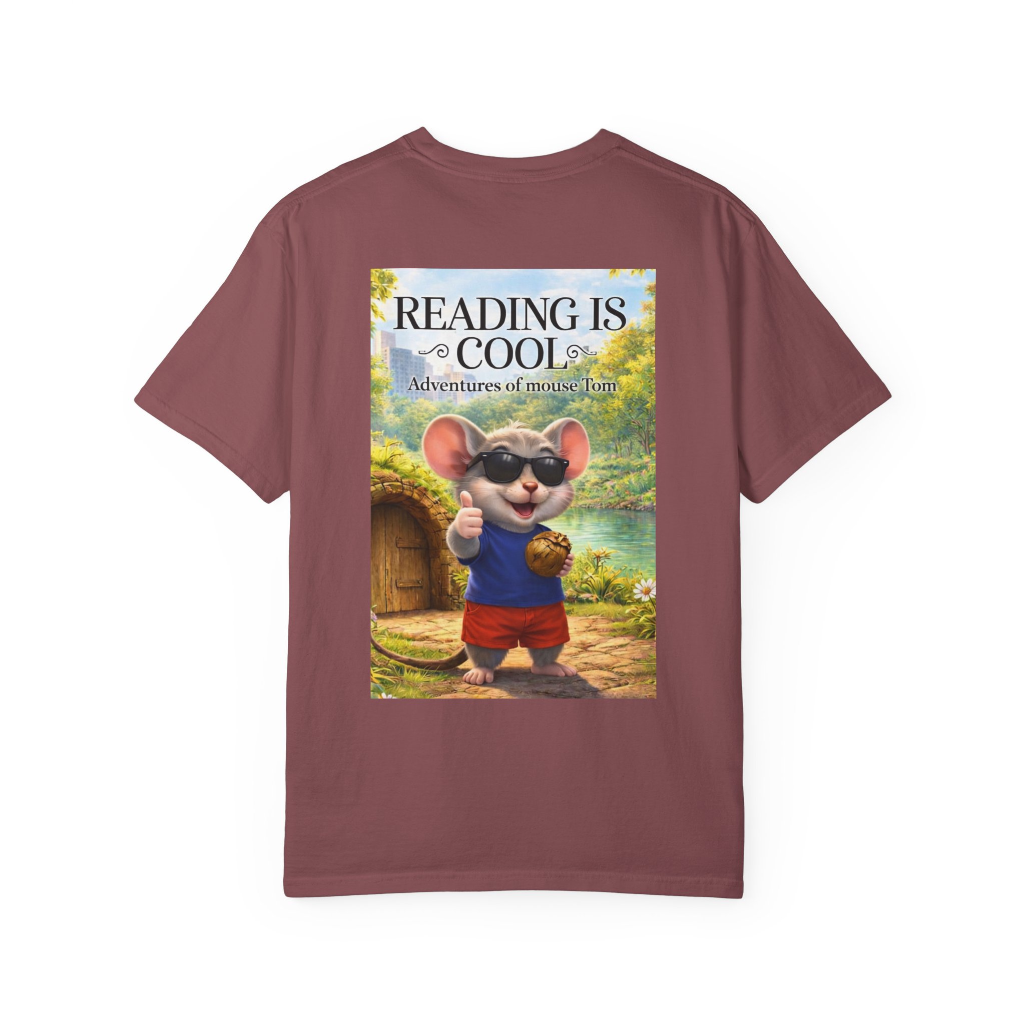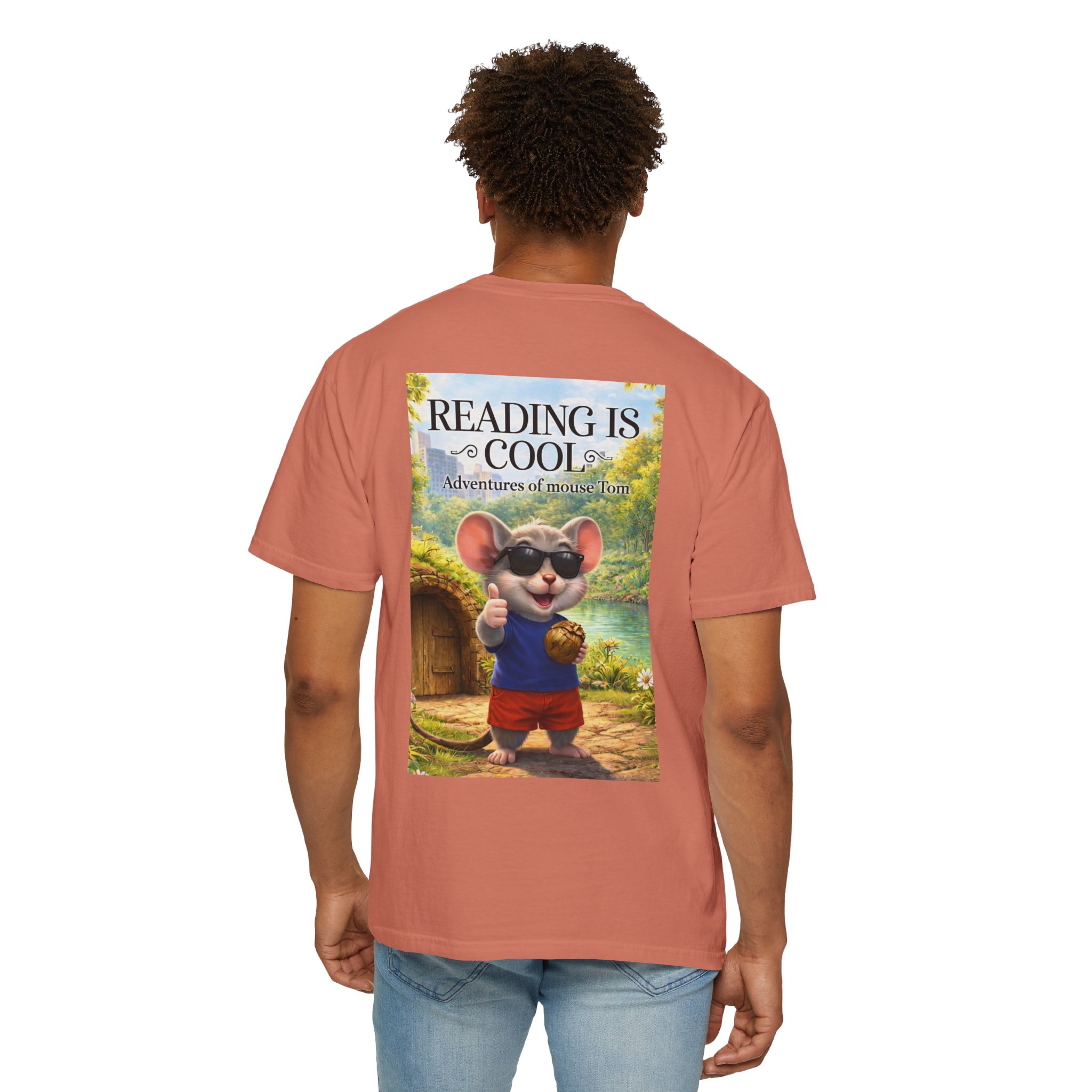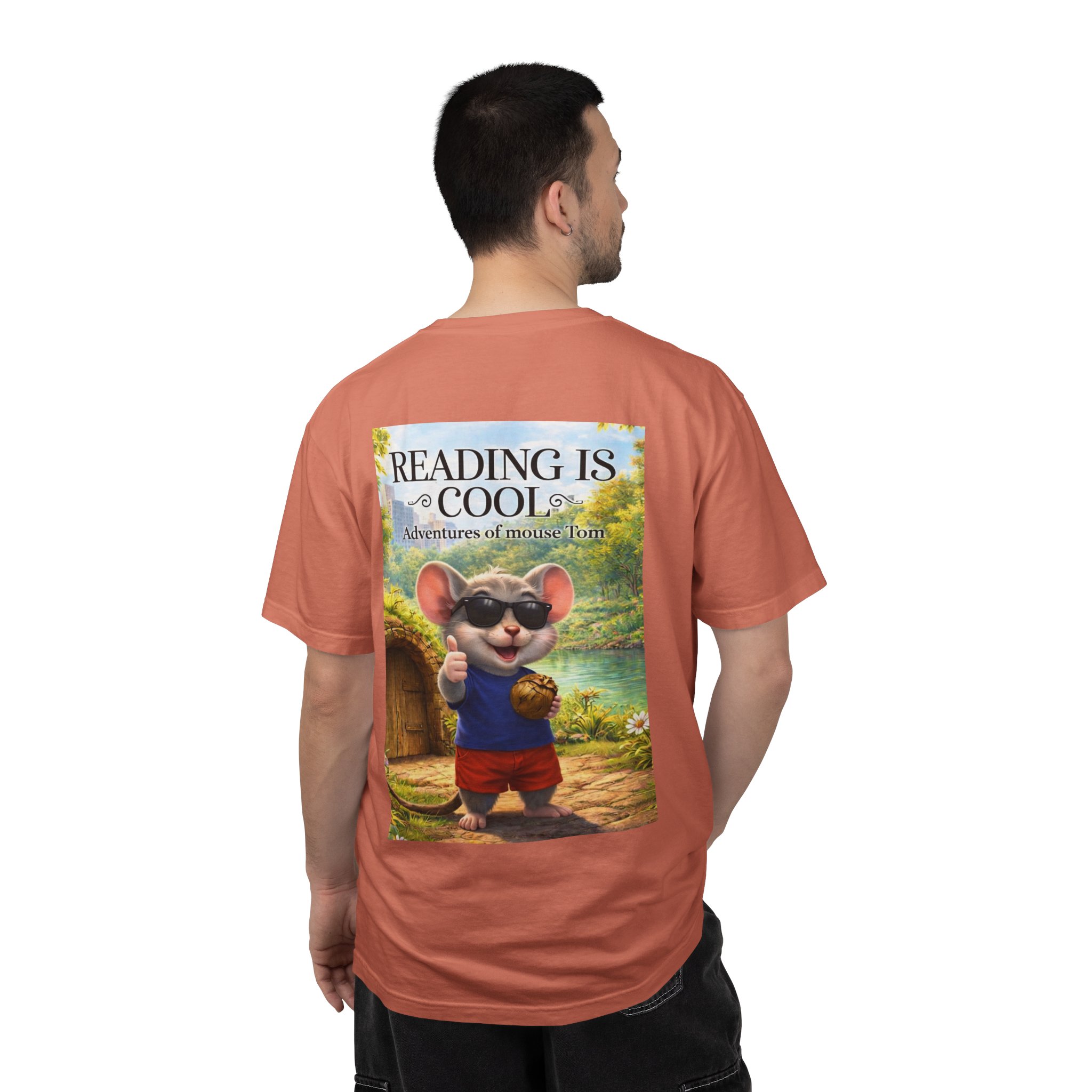 This relaxed-fit tee brings a soft, lived-in feel and a playful story to your everyday wardrobe. Garment-dyed and heavyweight, the shirt wears in beautifully—the color deepens and the fabric softens with every wash. On the front, a small, cheerful mouse in sunglasses adds a wink of personality; the back shows a full, bright illustration with the phrase “READING IS COOL” and a cozy, storybook scene. Wear it while reading in a sunny nook, taking a slow weekend stroll, or sharing a quiet moment with young readers. The roomy cut and sturdy construction let the design take center stage while staying comfortable through regular wear.